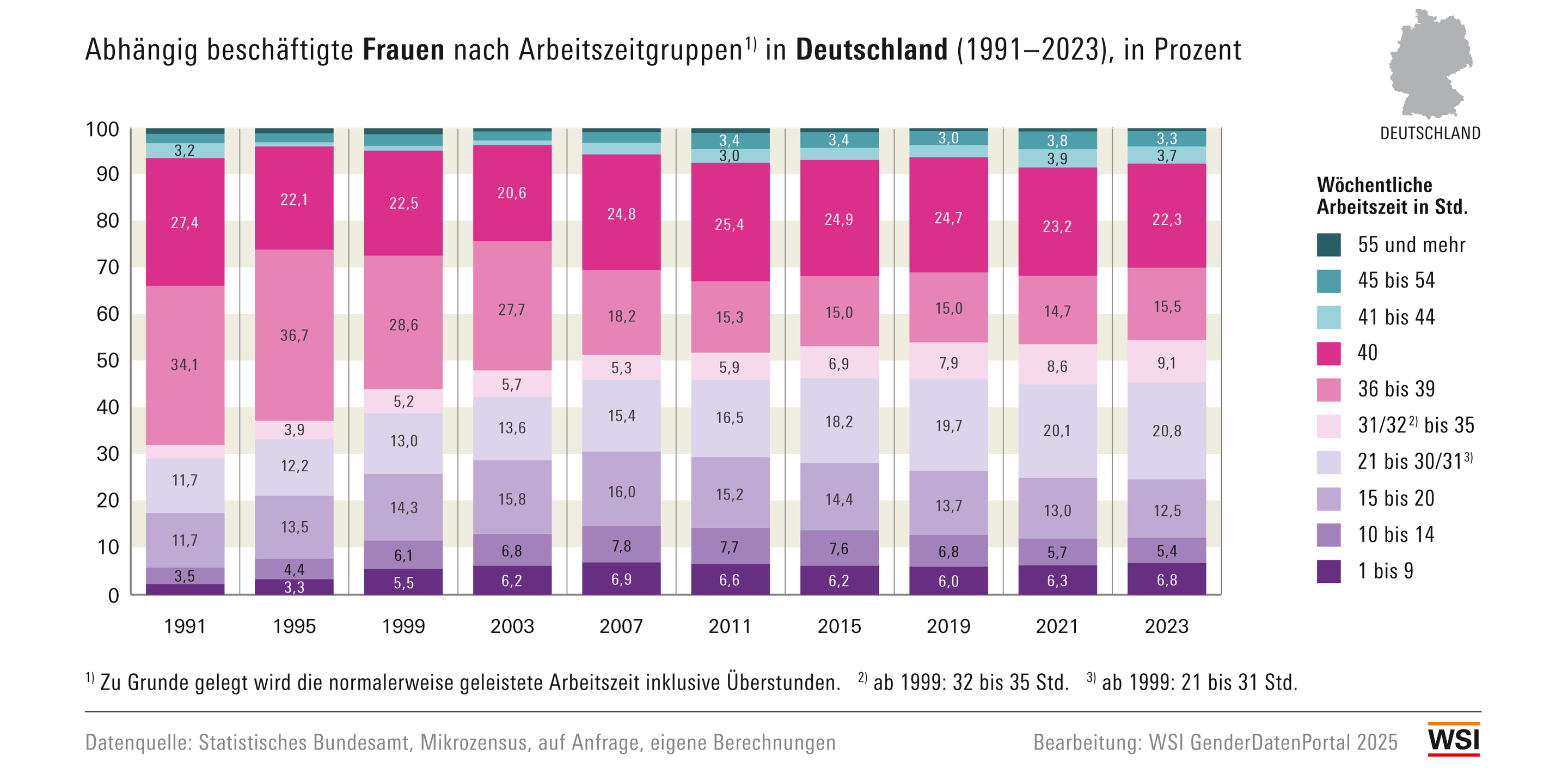 (2) Vgl. Pfahl, Svenja/Unrau, Eugen/Lindhorn, Anika (2025a): Abhängig beschäftigte Männer nach Arbeitszeitgruppen 1991 – 2023. In: WSI GenderDatenPortal.