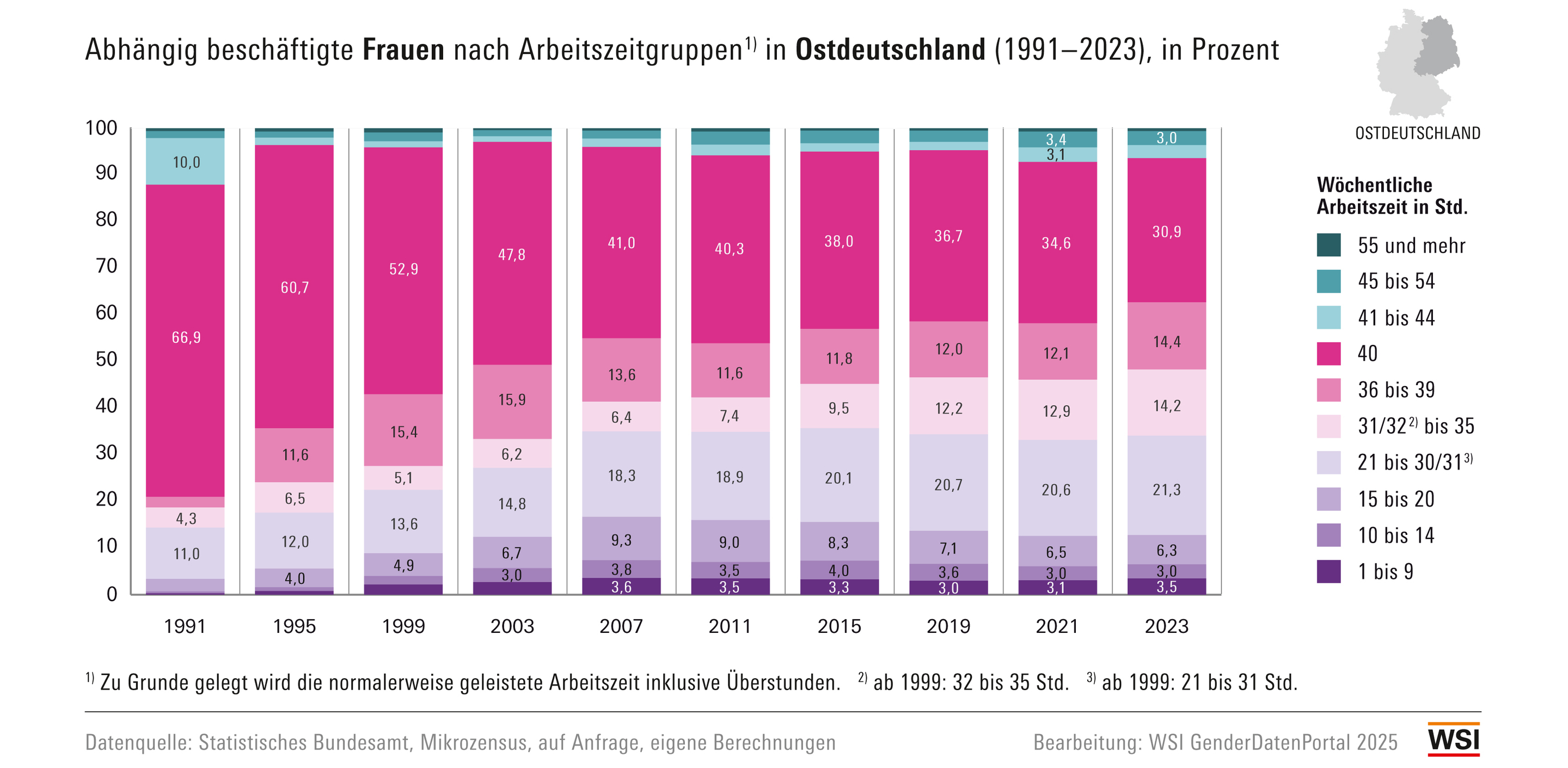 (3) Vgl. Pfahl, Svenja/Unrau, Eugen/Lindhorn, Anika (2025c): Teilzeitquoten der abhängig Beschäftigten 1991–2023. In: WSI GenderDatenPortal.