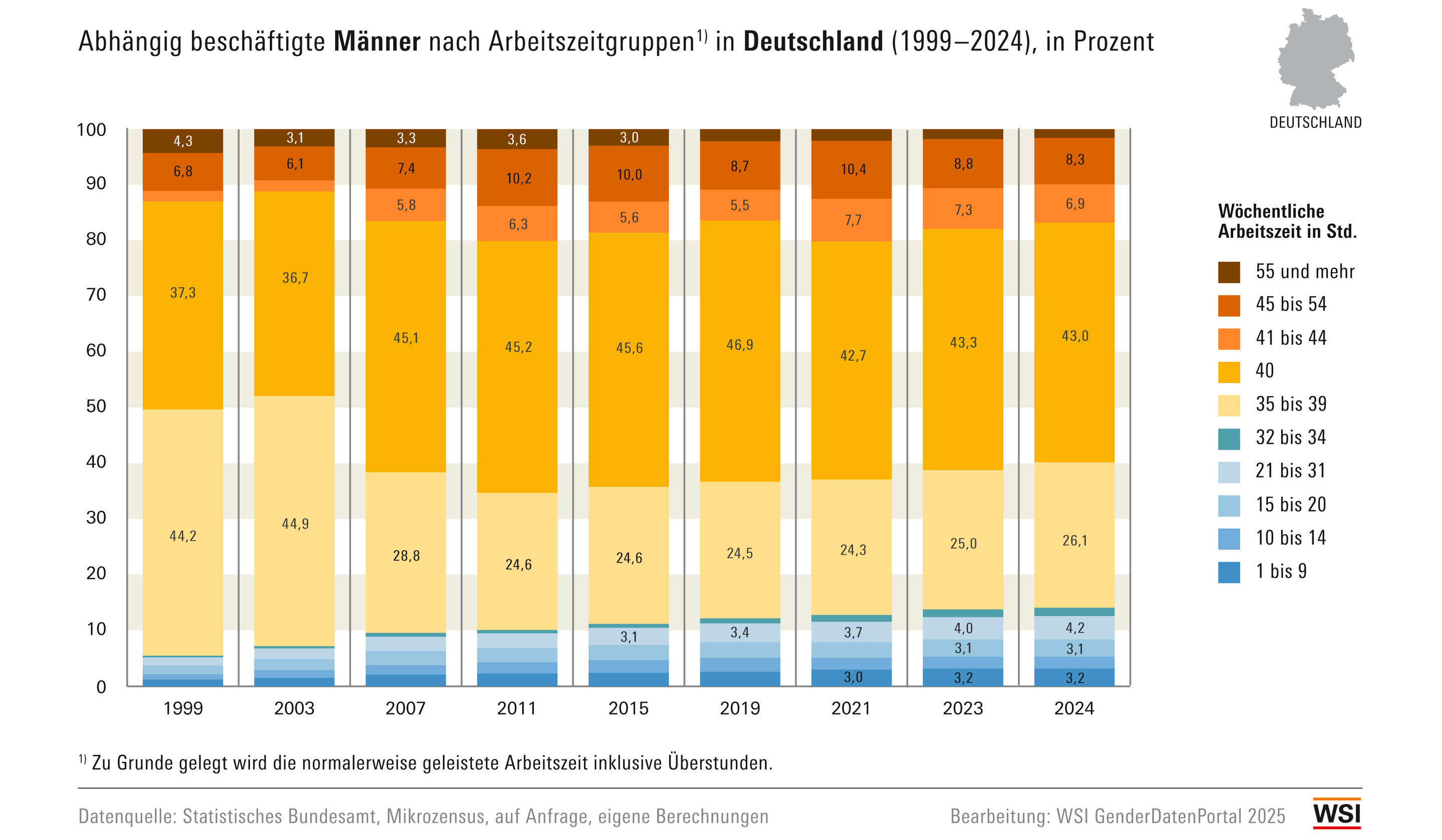 Die normalerweise geleisteten Wochenarbeitszeiten von abhängig beschäftigten Männern in Deutschland kennzeichnen sich innerhalb des Beobachtungszeitraums 1999 bis 2024 durch zwei unterschiedliche Tendenzen: Einerseits arbeiten Männer seit ca. 15 Jahren verstärkt in (über)langer Vollzeit, andererseits sind aber auch immer mehr Männer teilzeitbeschäftigt. Innerhalb des Beobachtungszeitraums lassen sich deutliche Verschiebungen zwischen den einzelnen Arbeitszeitgruppen erkennen: