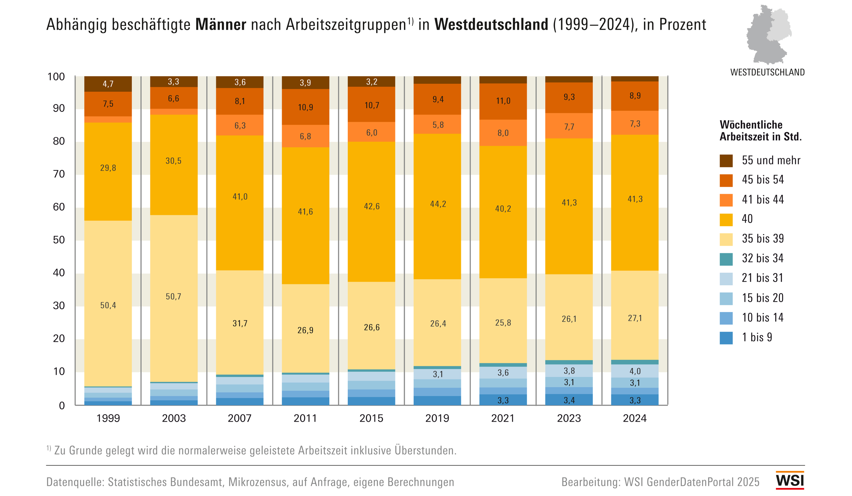 WSI GenderDatenPortal: Zeit: Abhängig beschäftigte Männer nach Arbeitszeitgruppen 1999–2024